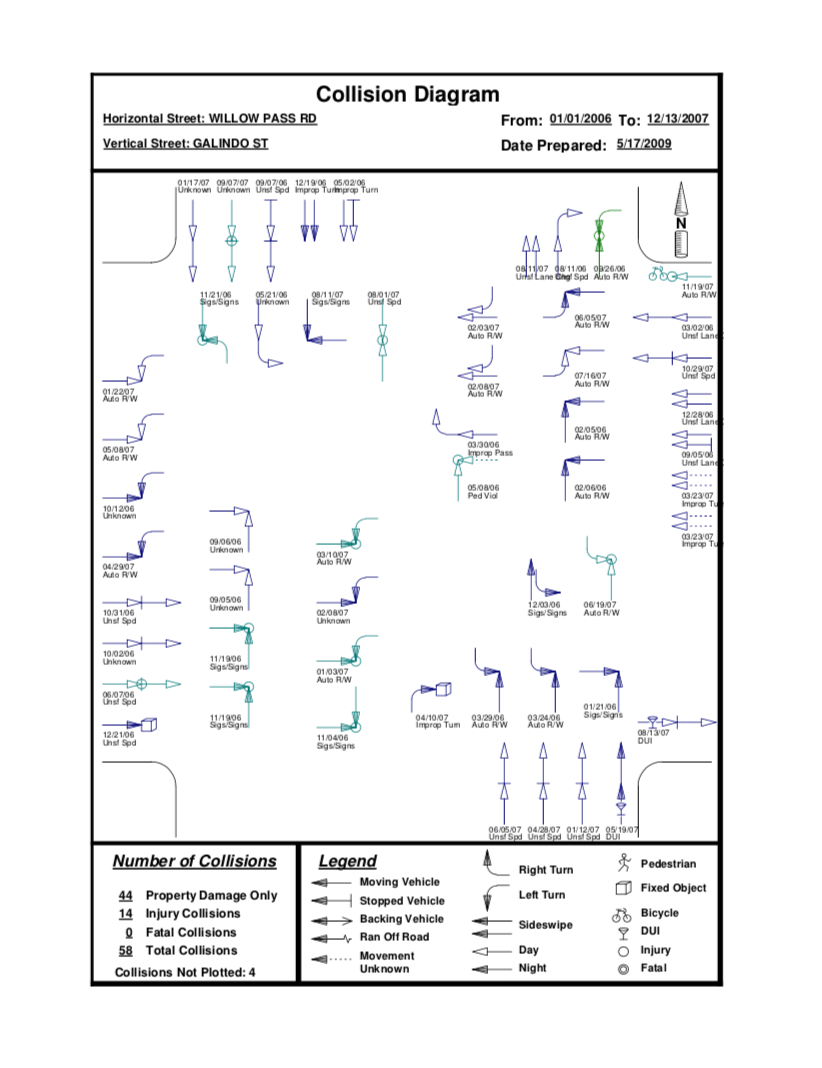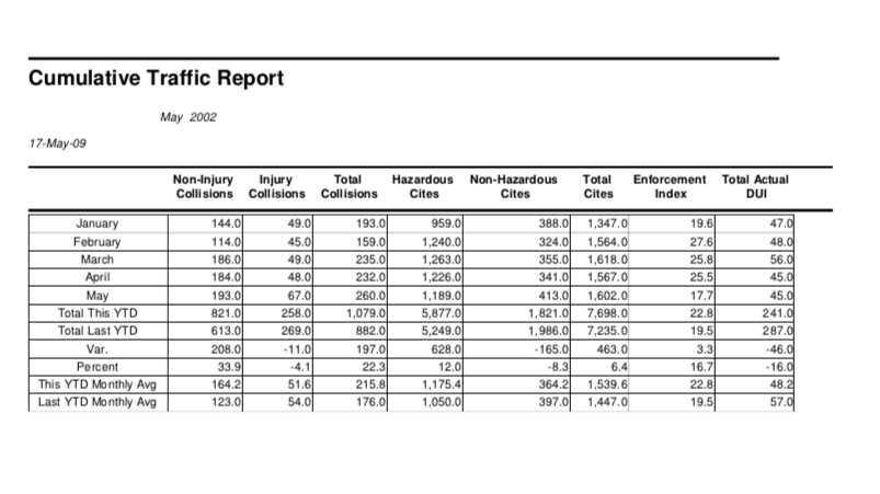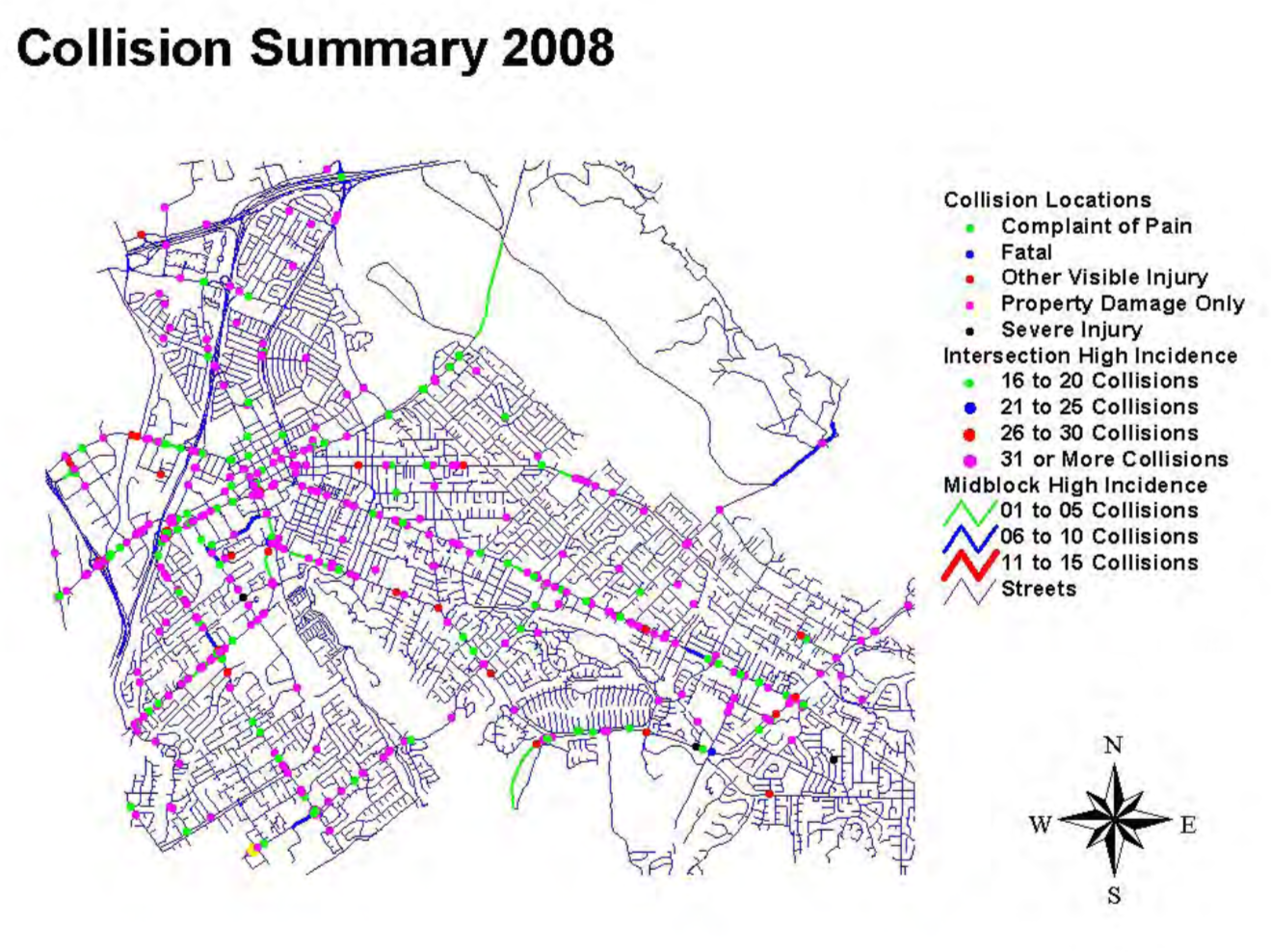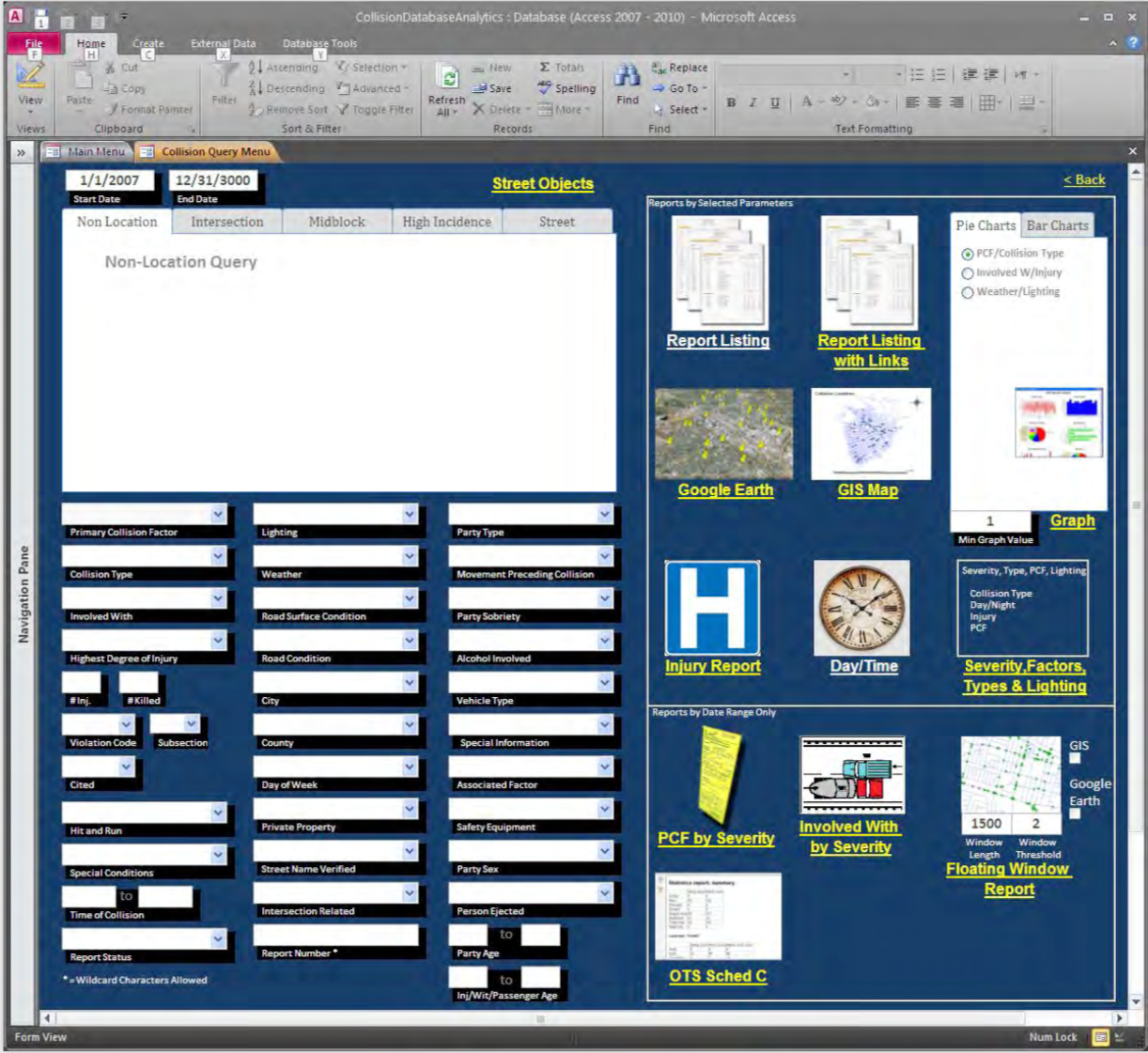 is in use by over 350 Police Department and Public Works agencies. The system provides a wide variety of queries and reports to summarize traffic collisions and citations and produces report listings on any relevant data in collision and citation records. You can run queries by Cause, Type, Conditions, Location, Location Rankings, Injuries and produce Collision Pattern Diagrams, Bar Charts, Pie Charts, Report Listings, GIS Mapping and Google Earth Mapping. This application has been in use and development for over 25 years.